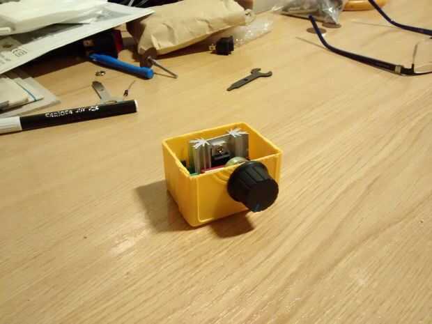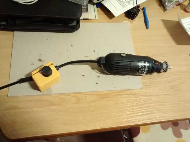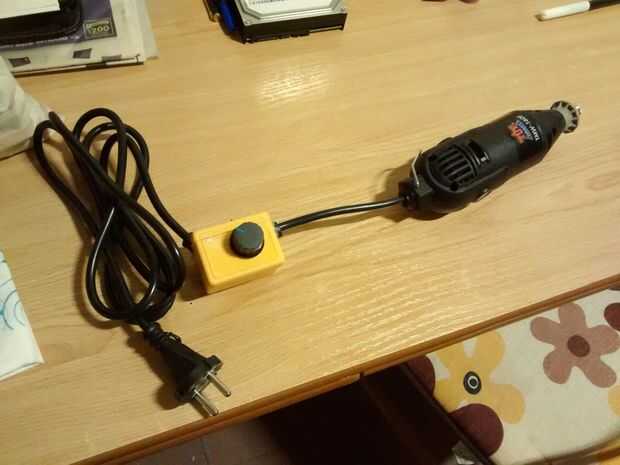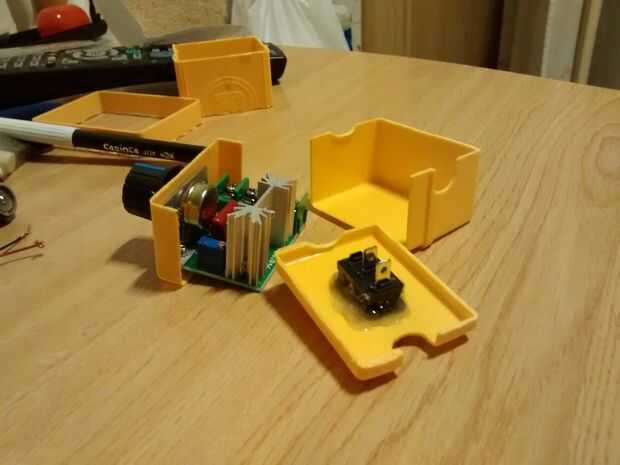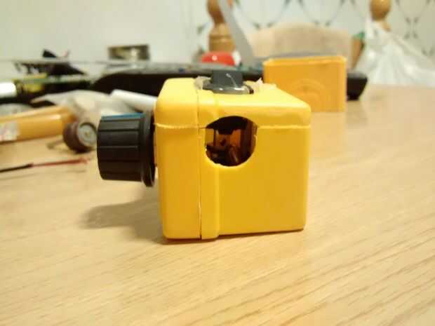 Tablero de SCR fue insertado en un agujero perforado en lo que fue tapa de la caja de diapositivas a través del eje de su potenciómetro (con una piedra de moler, que hice un ajuste de menor importancia sobre una lengüeta metálica que sobresale molestosa en marco del pote de SCR). Otras cosas que hice con la multiherramienta: los orificios para el interruptor, cable de entrada y salida del cable.