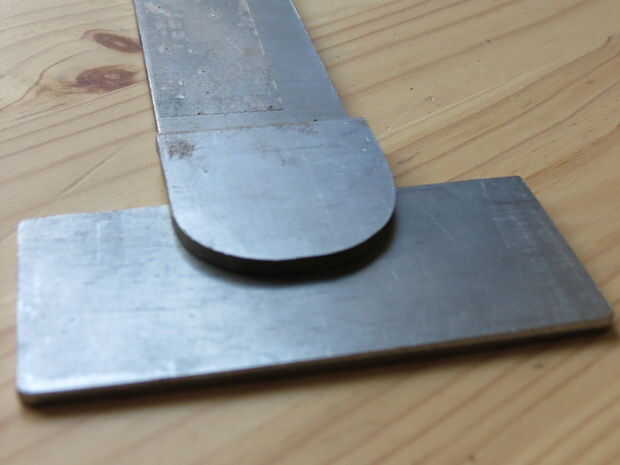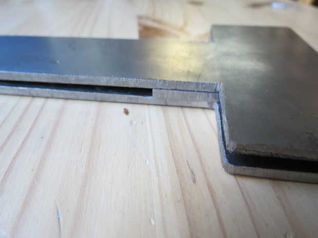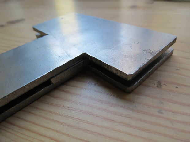 Consiste en el "marco" de las dos piezas "T" y el "espaciador". Estas piezas fueron cortadas de la hoja de acero de 1/8" con una sierra de cinta. Con el espaciador entre las dos "T" s, la ranura se forma donde se montarán las cabezas. La brecha en el área de la manija se llenará por la hoja del ABS de 1/8" en un paso posterior.