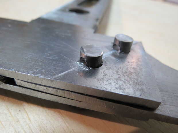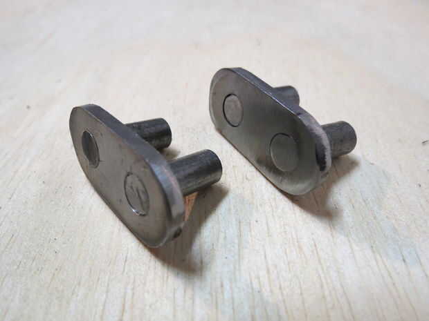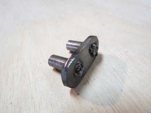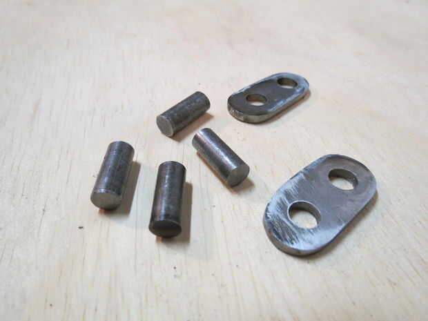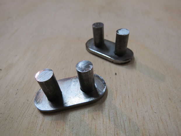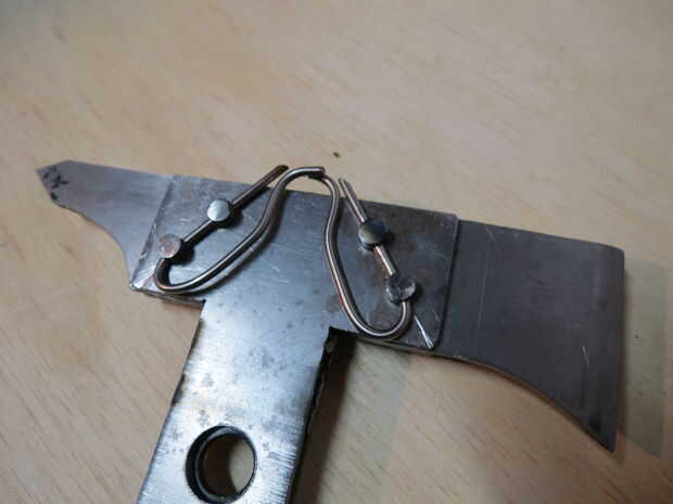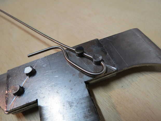 Entonces fueron formados los pasadores insertando el alambre de acero a través de los orificios y luego doblarlo sobre sí mismo. Después de unas cuantas más vueltas y con un par de pinzas, la forma final se logró. Ver fotos para mayor claridad.