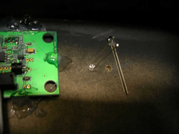 Agujeros en la parrilla para el receptor remoto IR, LED de standby encendido y encendido LED fueron perforados de la parte delantera (con cuidado) para asegurarse de que estaban perfectamente en el agujero de la rejilla correspondiente. El LED y el receptor eran entonces encolar en su lugar y por cable.