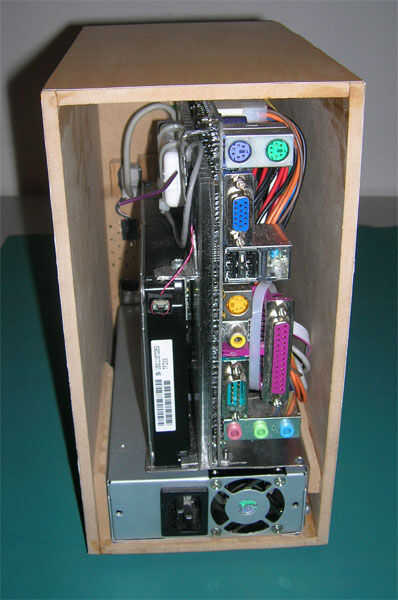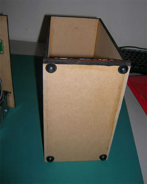 Se pegan dos piezas de madera prensada en el interior de la caja para dar un ajuste más exacto de la fuente de alimentación.