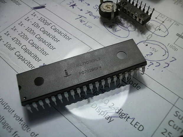 El ICL7107 vino a mi mente. Un sencillo, antiguo pero fiable convertidor analógico a digital utilizado en los circuitos del voltímetro digital. ¿VOLTÍMETRO? ¿Por qué no construir un voltímetro, luego calibrar para obtener la velocidad del coche de mi paso a paso motor? ¿y obtenga el RPM de mi salida de voltaje del LM2917? ¿Por qué añadir un termómetro digital utilizando el sensor de temperatura LM35?