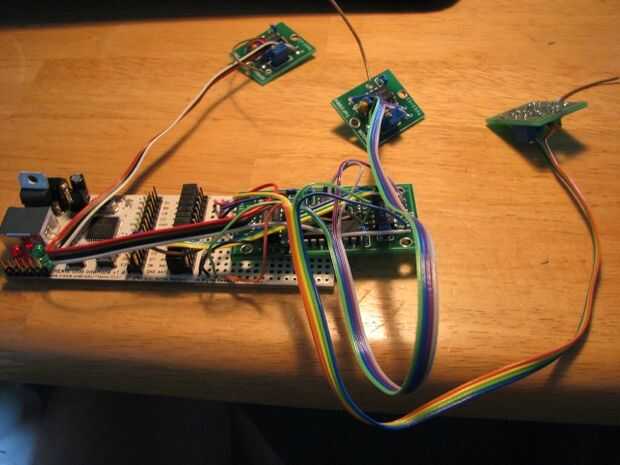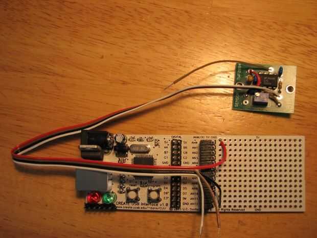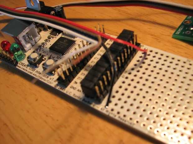 Desde el II de ThereminVision obtendrá su poder desde la interfaz de USB crear (que a su vez recibe su energía del USB), me decidí a conectar la alimentación para cada uno de los módulos del sensor de ThereminVision directamente a la interfaz de USB crear - esto hace que sea un poco menos de un nido de pájaros en el cableado desde allí son ya un montón de los cables en la placa de procesador de TherminVision.