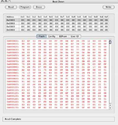 La captura de pantalla siguiente muestra el OS X programa Arranque abajo por Craig Schimmel - una utilidad de bootloading Macintosh para el CUI. Si estás en windows, lo más fácil es utilizar herramienta de Microchip, PDFSUSB.exe que es descargable desde su sitio web o incluido en este ejemplo de código para el interfaz del USB crear.