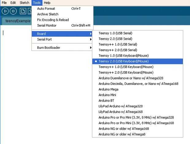 1 hacer un dibujo nuevo y copiar el código en o abrir un dibujo existente. Antes de cargar, seleccione el elemento "Teensy 2.0 (teclado USB, ratón)" de herramientas, menú de tablero.