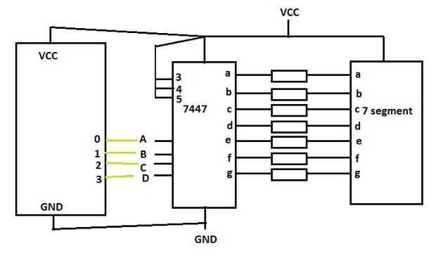 Sedangkan untuk menghubungkan Chip 7447 ke Arduino, bisa langsung disambung, karena punya tegangan nivel logika yg sama TTL.