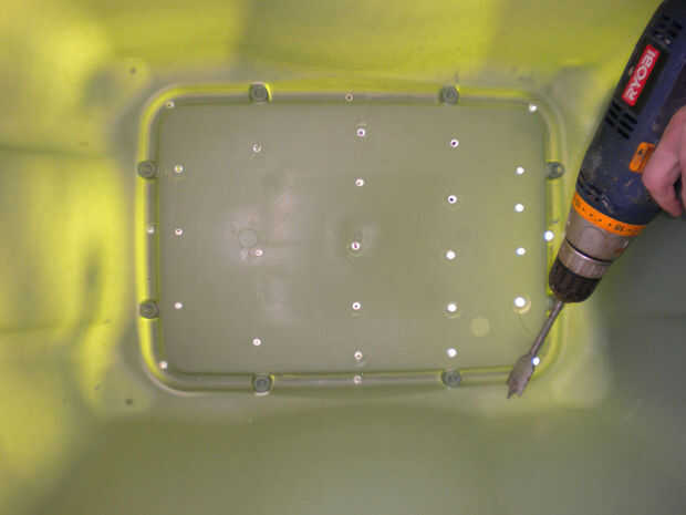 Con 3/8" pedacito de taladro, taladro varios agujeros en el fondo del primer recipiente. Esto servirá de drenaje para el líquido que se crea naturalmente por el trabajo del gusano. Este es el bin que se colocará sobre la bandeja.