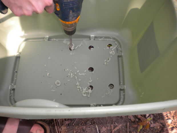 Con broca de 3/8, repita el paso dos en la parte inferior de la cubeta restante. Estos agujeros servirán como corredores para sus gusanos a viajar desde el depósito inferior (una vez que el compost se descompone satisfactoriamente) en la parte superior para repetir el proceso.