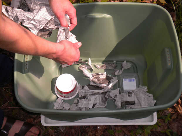 Romper un pequeño periódico reciclado para la ropa de cama en la parte inferior del recipiente (aproximadamente 2" profundamente no embalado, o una hoja completa abierta.)