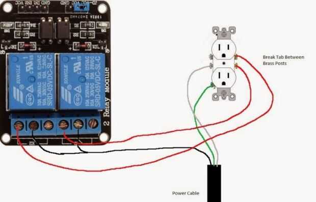 6. en la placa de relé, conecte el terminal "abierto" para puesto de relé 2 para el bronce "caliente" de la toma de corriente duplex inferior. Utilice un cable rojo o cable negro.