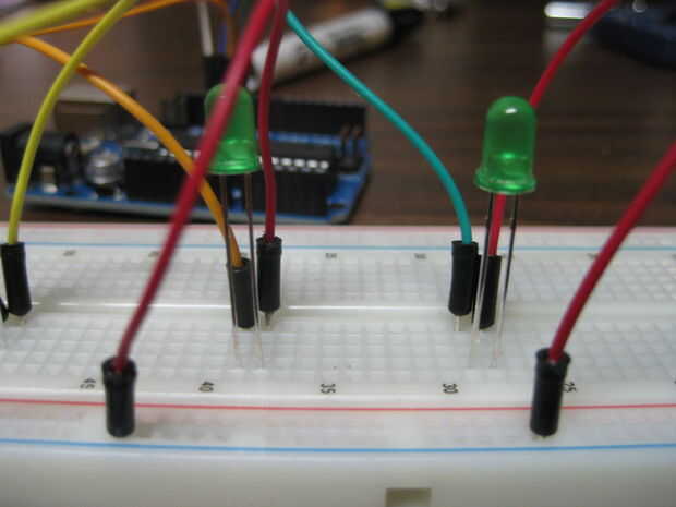 En primer lugar, conecte un cable de 13 en el Arduino a la fila superior en el protoboard.