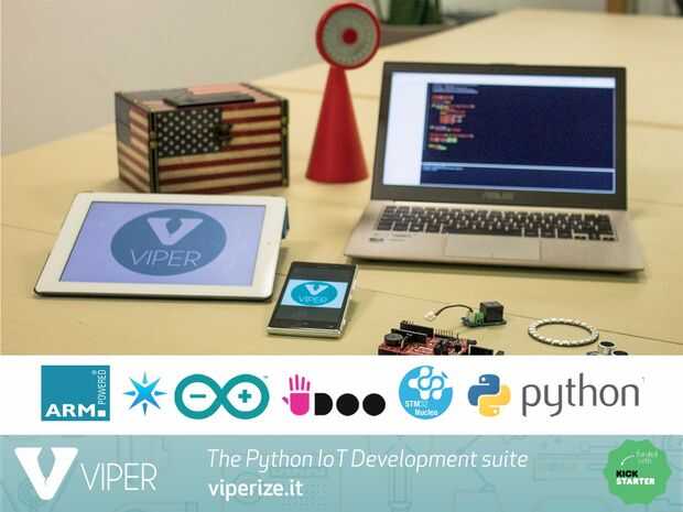 VIPER es una suite de desarrollo fácil de utilizar para el diseño de alto nivel de objetos interactivos preparados para la nube y la IoT. VIPER se compone de un IDE multiplataforma, una aplicación móvil y una máquina Virtual que se ejecuta en varias plataformas. Con VIPER creativos, diseñadores y profesionales pueden convertirse en Python para Arduino DUE, Nucleo ST y la mayoría de productos de partícula (anteriormente chispa) y las placas similares con paradigmas y características típicas de PC y programación móvil.