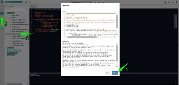 Una vez instalado VIPER, puede abrir el explorador de ejemplo (paso 1 en la imagen) de que VIPER ejemplos oficiales pueden "clonarse". Seleccione el ejemplo llamado "Multi Blink" (paso 2) y clonarlo (paso 3).