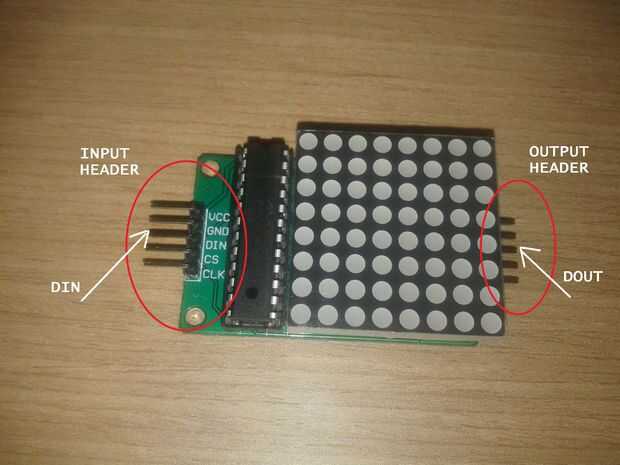 Para el resto de los pines (VCC, GND, CS y CLK), el PIN en la cabecera de entrada es físicamente conectado/acceso directo a la patilla en la cabecera de salida (esto es porque el MAX7219 Margarita compartiendo un bus SPI).