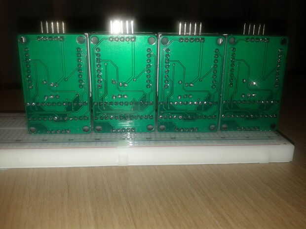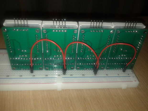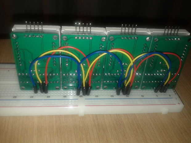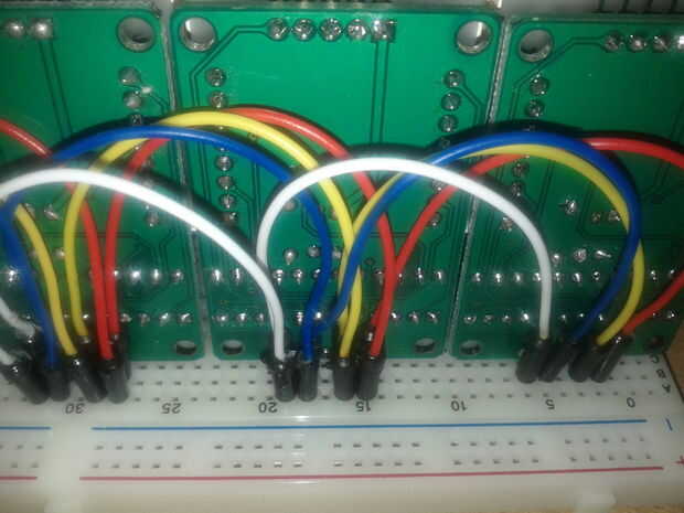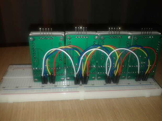 Ahora tienes que conectar todos los pines de VCC de las matrices de cuatro. Utilice 3 hilos del puente (M/M) y conecte usando los agujeros de la protoboard: