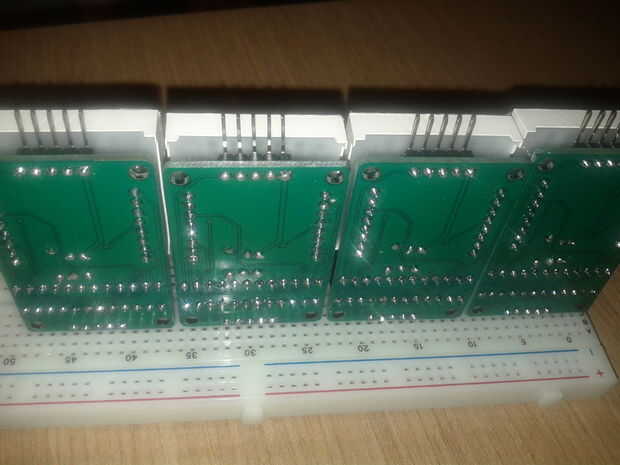 Use la placa enchufe de las matrices. Conéctelos a través de las cabeceras de entrada (el chip MAX7219 debe estar por debajo de la matriz de LED). y la cabecera de salida que pines deben aparecer en la parte superior).