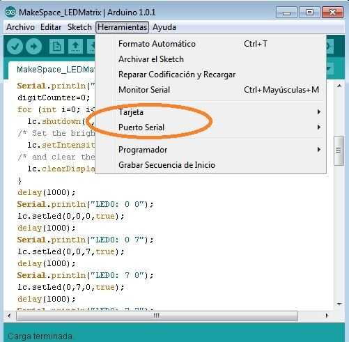 Note1: Si la versión de su IDE de Arduino está "absolutamente" viejo (0.x) tendrá que cambia la extensión de lo sketch de arduino de .ino a .pde (MakeSpaceTitle_LEDMatrix.ino -> MakeSpaceTitle_LEDMatrix.pde)