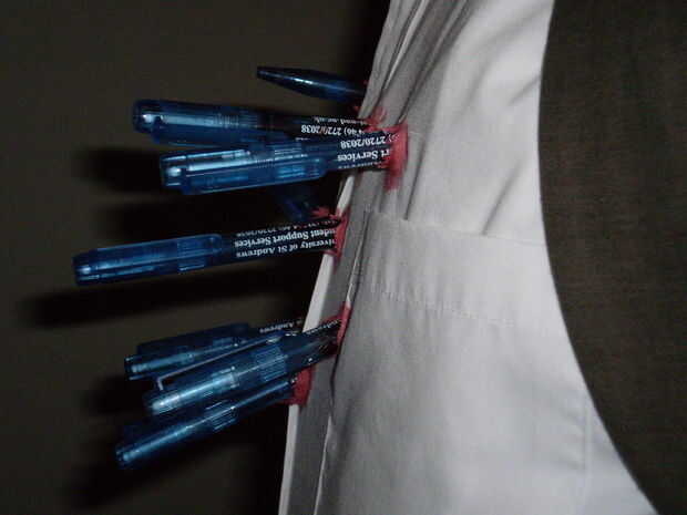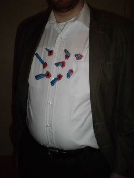 tuvo que pensar en un disfraz rápido, sutil y barato para llevar al trabajo para Halloween este año y subió con esta idea. Trabajo como un consejero en una Universidad y quería probar e integrar trabajo en mi traje. Mientras mira alrededor de la oficina me di cuenta que tenía toneladas de plumas departamentales colocación alrededor y pensé: 'lo guay sería es parecía que uno de mis estudiantes no estuvo de acuerdo con mi Consejo y he tomado la libertad de obligar a un puñado de plumas a través de mi pecho?'