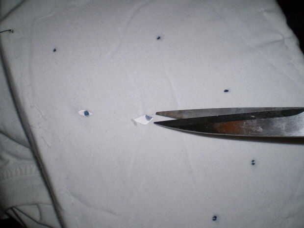 Primero, corte una pequeña ranura en la camiseta blanca fueron que dejó su marca. Coloque la pluma a su gusto y Aplique pegamento caliente. Mantener en su lugar por unos minutos y luego continuar a la siguiente pluma.
