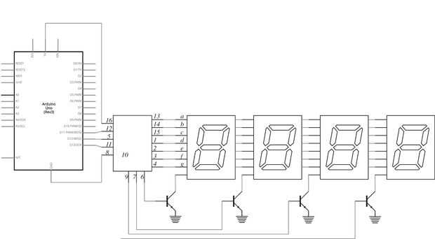 Conectar todo como se muestra en el esquema (si su pantalla de 7 segmentos es clasificada en una tensión más baja entonces 5v que recomendaría poner una resistencia de 220Ω entre cada ánodo y la viruta, se puede ver esto en el esquema en el paso 1).