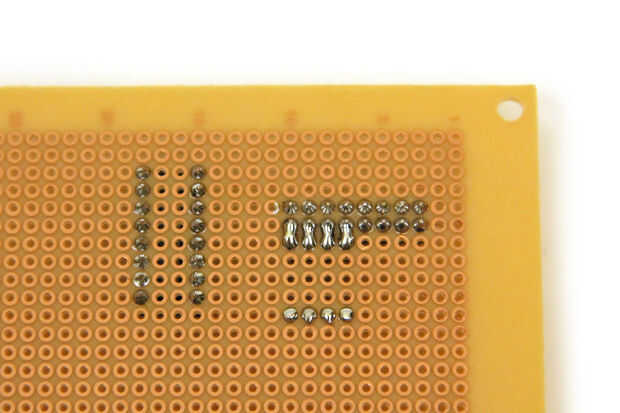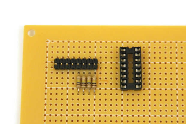 Soldar un zócalo de 8 pines a la protoboard como se muestra en las imágenes de arriba.  Siempre es una buena idea utilizar un zócalo para ICs; evita dañar el IC del calor del soldador y el IC fácilmente puede ser quitado y reemplazado si es necesario.