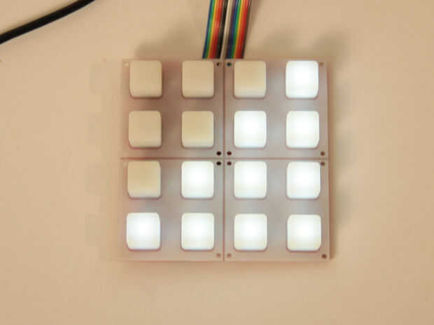 En el código a continuación, configurar el array "ledData". Cada número en ledData corresponde a una fila de LEDs de la matriz de 4 x 4. El primer número (por defecto 1) corresponde a la fila superior, el segundo número (por defecto 3) a la segunda fila y así sucesivamente... Los valores en ledData pueden ir de 0 - 15, donde 0 es todo el LED apagado en esa fila y 15 es todos los LEDs en esa fila. Puede obtener cualquier combinación de encendido y apagado de LEDs por encontrar su binario equivalente y almacenar este valor en la matriz ledData. Los valores por defecto en ledData va a generar el patrón que se muestra en la figura 2. Trate de cambiar los valores predeterminados y ver los resultados, cambiando ledData a {5,3,7,15} que genera el patrón que se muestra en la figura 3.