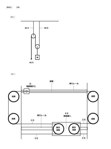 El tercer diagrama muestra las poleas movidas por un motor eléctrico en el primer carril y en el segundo mueve un generador eléctrico, en teoría usando dos poleas móviles multiplica cuatro veces la fuerza del motor eléctrico, Finite generar su propia energía.