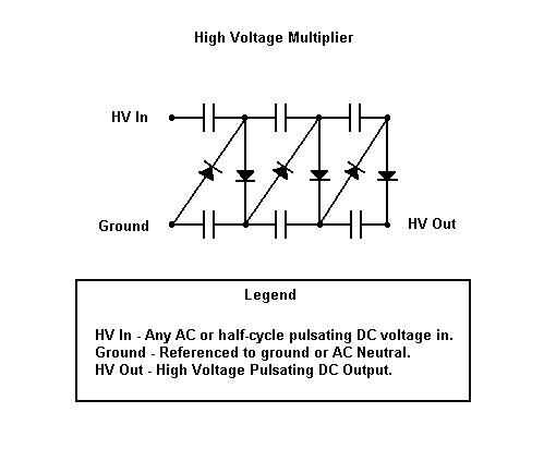 Basado en el doubler de Villard, en cascada en múltiples etapas, este circuito multiplicará un pequeño voltaje de CA en un enorme potencial.