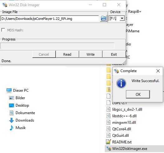 Quemar el piCorePlayer OS con Win32Diskimager en tarjeta SD y copiar el archivo de configuración modificado "newconfig.cfg" en la carpeta raíz.