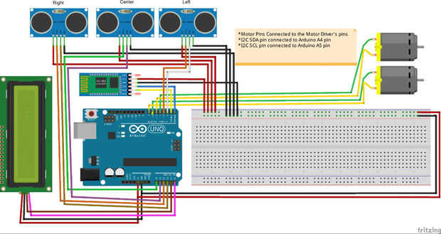 Siga este diagrama de cableado para conectar las partes. También se incluye en el programa de instrucciones. Cuando lo hayas hecho, sube el programa entonces. Asegúrese de soltar los pernos de HC-05 RX TX de los pines de Arduino antes de subir.