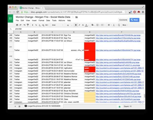 Nuestra solución a ambos problemas fue compilar todos los metadatos acerca del uso de nuestras etiquetas en las redes sociales en una Hoja de cálculo de Google, y luego tener nuestra presentación de diapositivas en vez de hablar directamente a los servicios de redes sociales. Esto nos permitió un) filtrar las cosas que no queremos y b) incluyen Twitter, b y c nuestro plugin de changeomatic.js puede hablar con Google Spreadsheets.