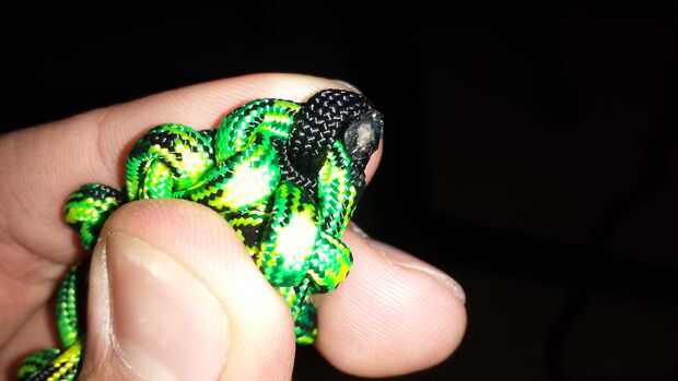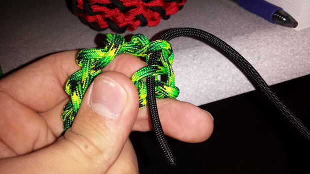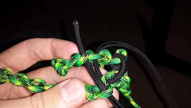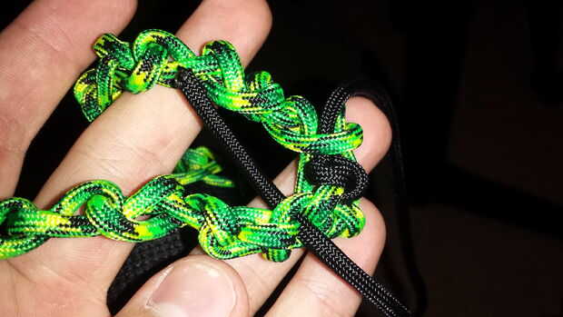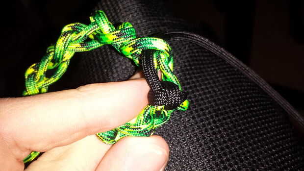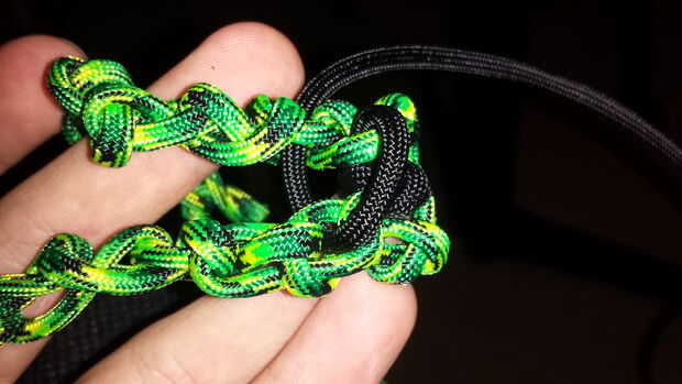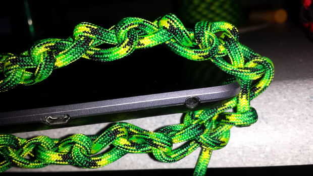 Después de tener algunos de los Sinnet de cadena hecha, envolver alrededor de lo que desea adjuntar (en este caso, una antigua tableta nexus) y elegir uno de los enlaces de cualquiera de los extremos y atar el cable (negro) secundario a él. Después de esto, es tan simple como la colocación del cordón a través de los enlaces 1 a 1.