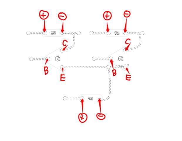 6) finalmente, dibujar las almohadillas de contacto adicionales que se ramifican fuera de la Base de cada transistor, el terminal positivo (+) batería y los cables positivo (+) para cada LED.