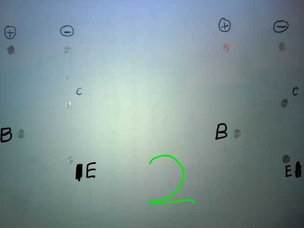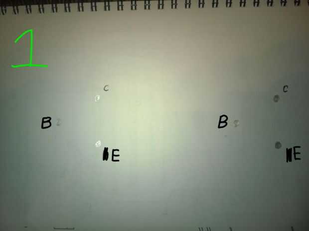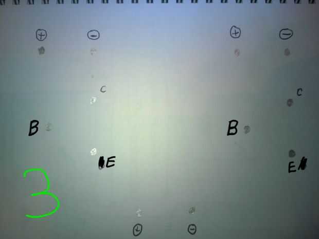 1) comienzan con el dibujo de las seis almohadillas de contacto para los transistores. No es necesario llenar el círculo entero de su plantilla; lo suficiente como para llegar a los pies del módulo para hacer contacto. Yo he marcado el colector, Base y emisor con C, B y E.