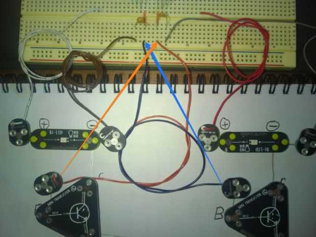 Ahora vamos a conectar la base de cada transistor para el carril positivo del circuito opuesto.