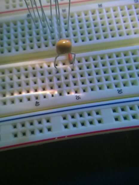 Inserte uno de los capacitores de 100pF con uno conectado con el cable de puente y el otro en una fila vacía.