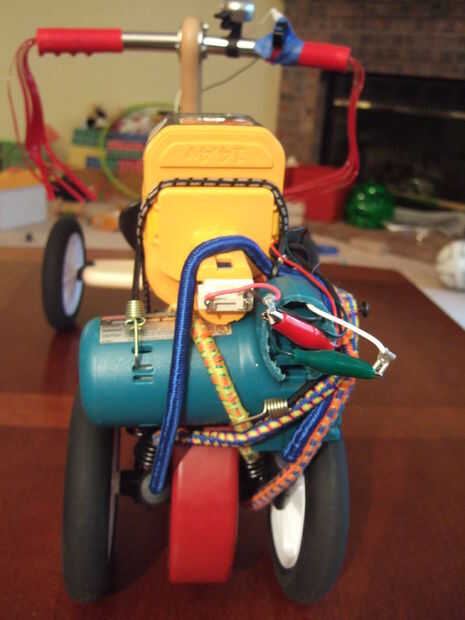 Sin dañar el trike, hay tres monturas de buena cuerda de amortiguador auxiliar. Las dos cubiertas de plástico eje y la parte posterior tornillo de orificio para el asiento. El truco es conseguir las cuerdas del amortiguador auxiliar para sujetar firmemente el motor y mantenga la rueda de fricción para el neumático.