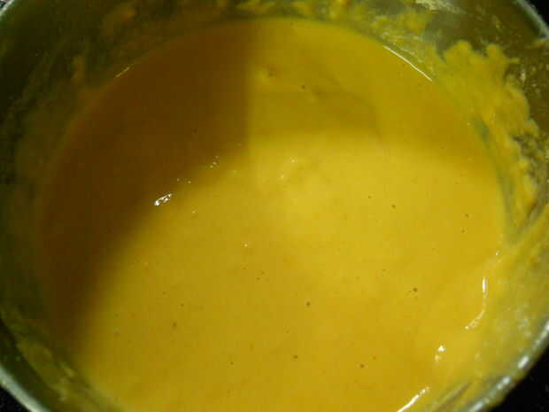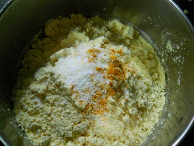 -tomar 6 cucharadas heapfull de harina de gramo añadirle sal al gusto, la pizca de soda y cuarto cucharadita de polvo de cúrcuma.