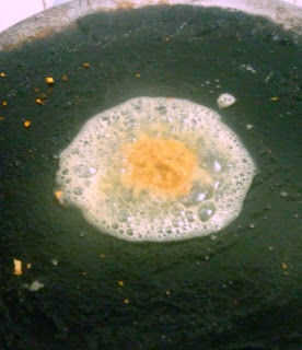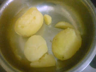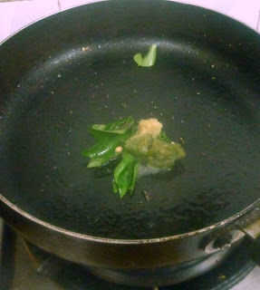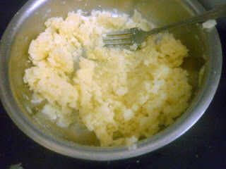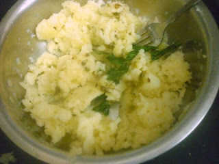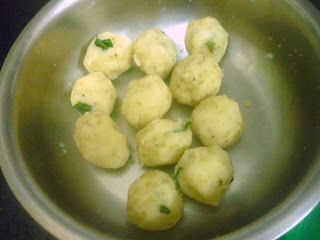 Calentar una sartén con aceite, Temple con semillas de mostaza, hojas de curry. Agregar pasta de jengibre ajo pasta, verde Chile, saltear bien. Luego añadir esto a las patatas trituradas y mezclar bien. Dividir la mezcla de patata en bolas iguales.