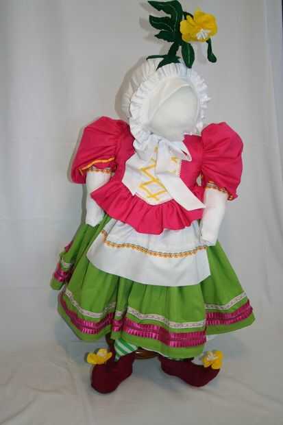 La tela blanca y cinta amarilla fueron atados a la parte delantera después de la parte superior fue montada. Son mano cosida en su lugar. El delantal es que un rectángulo de tela recogida ar la parte superior con una línea de ajuste cosido en la parte inferior.