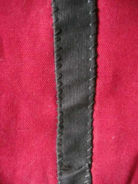 Marque ligeramente la línea que la banda seguirá todo el tabardo (la franja será en el lado de la tela que la parte doblada no es sobre). En la mía, como observa, la tira es como cerca del borde como sea posible sobre los hombros y la parte inferior ("colas") en ambos lados. Entre las partes, que sólo libre ligeramente una línea conecta ambas áreas.