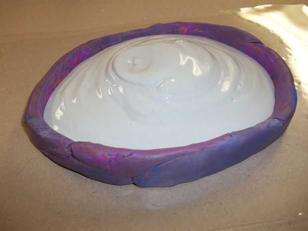 - Vierta el yeso en el molde que has preparado. Vierte en la sección arremolinada y permiten difundir a partir de ahí. Llene hasta casi la parte superior. Toque en el molde o la superficie es a incluso hacia fuera de la parte superior y liberar las burbujas. Golpee con fuerza hasta la parada de burbujas subiendo a la cima. Si la superficie de trabajo no es flexible, puede también recoger y golpéelo con cuidado directamente en el mostrador para liberar las burbujas.