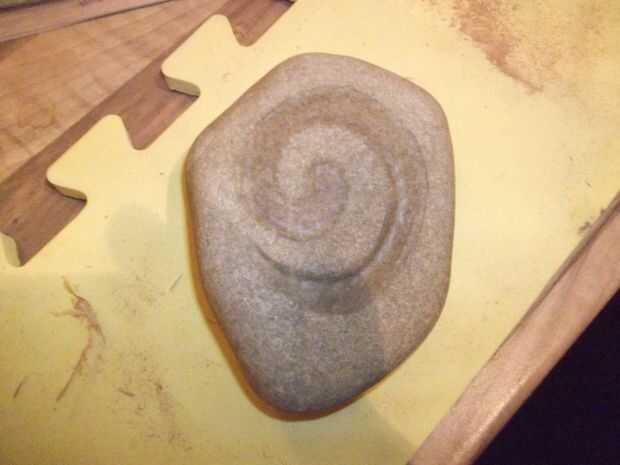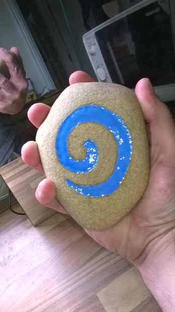 Primero pasé unas 3 horas en busca de la piedra derecha. Utilizando una dremel y muchos pedacitos de pulido tallados el emblema en la piedra llevó unas 5 horas o entonces pintado azul y construyó el brillo con unas capas de capa base de clavos.