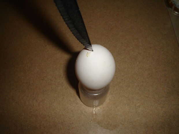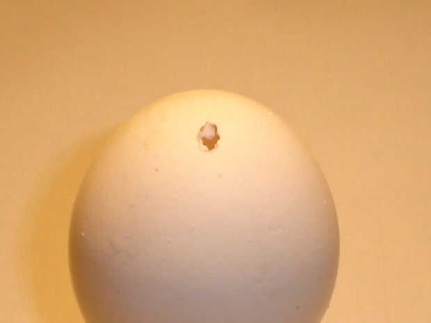 Hacer dos pequeños agujeros en la parte superior e inferior con el cuchillo y sopla con fuerza pero con cuidado a través de un agujero. No tirar el interior! Podría ser una gran tortilla!
