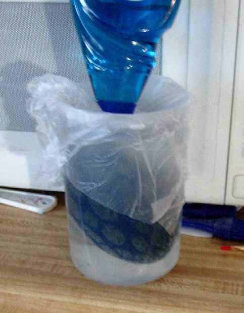 A continuación algunos Apoxie clay se usa para sellar el agujerito en la parte inferior aunque el huevo fue aspirado hacia fuera antes de llegar a mí, ponerlo como estrecho un contenedor como pude encontrar y aún así encaja el huevo, vierte el vinagre, cubre con envoltura de plástico y lastrados con una práctica botella de jabón líquido. Unas dos horas más tarde, tiré de él hacia fuera, y frota con una esponja de plato con agua caliente, así que los lugares donde el vinagre ha sido comiendo la cáscara (que se convirtió en suave y viscoso al tacto) consiguieran lavados lejos a un bonito verde azulado.