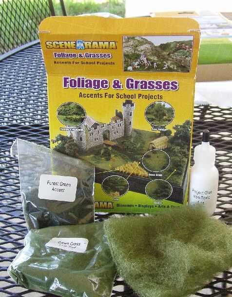 De cualquier manera, las instrucciones del kit sugieren que añadir pegamento parte alrededor de 1 a 3 partes de agua y una botellita de spray siempre, luego Vierta la hierba de la multitud en la coctelera siempre aerosol hacia abajo de una superficie con el pegamento diluido, luego agitar la hierba sobre él. Puesto que particularmente quería completamente cubrir mis montañas (que acabo de terminar de hacer y de que me sentía muy orgulloso por el momento), lo que hice en lugar de otro fue mezclar un poco de pegamento con sobre dos veces más agua en una paleta, luego tomó un pincel, hizo unos lenguados donde parecía probable que crezca hierba , y luego recogió un poco del rebaño de hierba en la punta de un cuchillo de plástico y lo sacudió con cuidado sobre los lugares que tenía pegamento. Admiraba mi trabajo un poco, añade unos toques más de pegamento, sacudió un pequeño rebaño, entonces se trasladó a otra zona y repite el proceso. Lo que tenia al final era algunos acantilados erosionados, con convincentemente escasos mechones de hierba que crece aquí y allá.