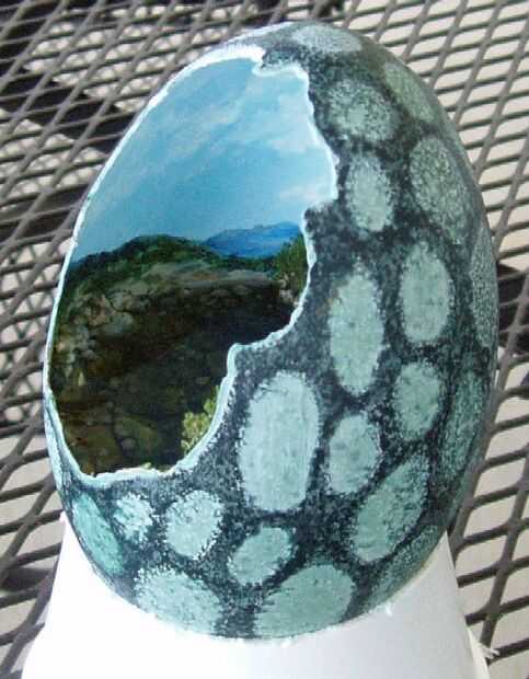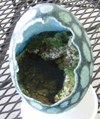 Por cierto, sólo tengo que decir algo bueno sobre la base temporal que estoy usando en este cuadro. Comenzó vida como un tazón de tecnopor en mi cafetería de la oficina. Cortó la parte inferior, vuelta boca abajo y listo, una base muy segura en unos 30 segundos. Realmente entretuvo la idea de utilizar como base para una base permanente para el huevo. Entonces vino a mí que una corona de ramas poco sería mucho más apropiada, si menos estable. Ahora, sé que he visto toneladas de ellos en todos los tamaños imaginables, pero cuando fui a todas las tiendas imaginables en busca de uno, no tienen nada que habría trabajado para mi huevo. Mordió la bala, compró algunas ramitas, algunos rafia teñida de marrón y una corona pequeña "basan", también twiggy y hacen mi propia. Mientras que no era tan bonito como lo que imaginaba, trabajó para mirar como un nido cuando fui al parque a tomar fotografías del huevo terminado.