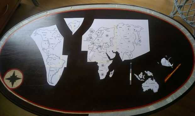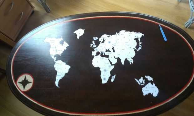 Pegué el mapa del mundo sobre la mesa usando el pegamento del aerosol (las instrucciones me dijeron sólo rociar en el papel de un palo no permanente, ideal ya que lo quiero para despegarse fácilmente). Separó los continentes un poco más de lo que debía, para cubrir más de la mesa.