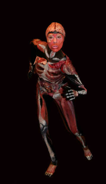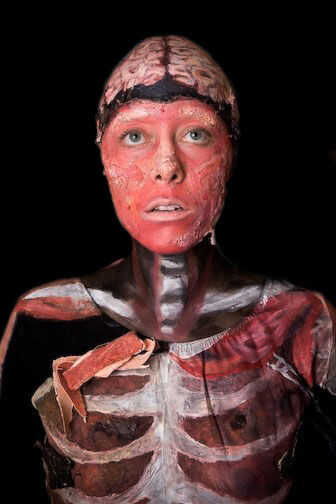 este traje hecho en casa fue inspirado por la ciencia internacional y la exposición "Body Worlds". He comprado a un maniquí y acolchado para que sea mi dimensiones (ella era más que yo, vaya figura :)). Compré un simple gato traje negro de lycra de cuerpo completo y ponerlo en el maniquí para pintar. Utilizando agua basado en una variedad de tamaños de pincel y pintura de tela, los sistemas esqueléticos y musculares deterioro en la demanda y luego a viejos Zuecos negro y guantes elásticos de pintado a mano. He utilizado acrílico regular pintura de tapón de los sesos a una calavera de látex, aunque escamas fácilmente y necesita retoques ocasionales. Cosí unas tiras de lienzo pintado en el escote para darle un aspecto de dimensión tres y para mostrar la piel de la peladura un poco. También cosí piezas de cecina de res en el traje para una extensión de los músculos pintados en unos pocos lugares (esto fue un gran éxito con los dos toros de hoyo en fiesta en casa de mi amigo, lamentablemente). La piel falsa fue hecha con gelatina Knox sin sabor mezclada con agua caliente y luego aplicado en mi cara después de que había enfriado/espesado un poco. Por último, apliqué pintura de la cara a mi cara y cuello, creando la médula espinal en la espalda, los músculos del cuello y la garganta y mantener mi rostro un rosa brillante pintar las cejas y los labios un blanco ish (fiel a la exposición).