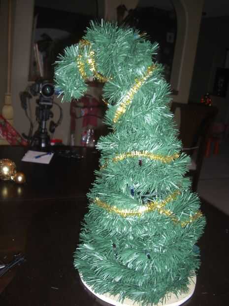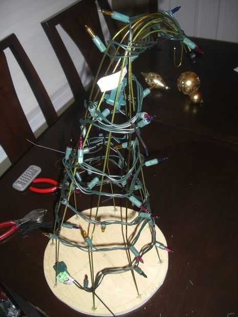 -Envuelva la cadena de luces alrededor de la estructura espiral hacia abajo y fijación de vez en cuando la cadena con a.... lo has adivinado... un cintillo o ligadura o cinta